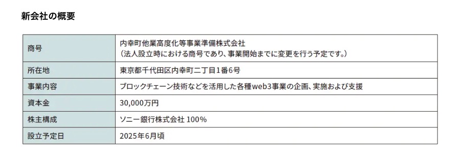 資本金は3億円で、ソニー銀行が100%出資する。設立は2025年6月頃、事業開始は同年秋頃を予定している。