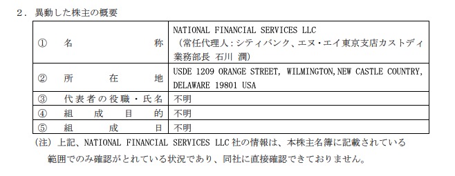 同社の発表によると、6月30日を基準日として、米国のNATIONAL FINANCIAL SERVICES LLC(以下、NFS)が同社の筆頭株主となった。同社の保有株式数は84,405,418株で、総株主の議決権の数に対する割合は12.90%に達している。3月31日時点での保有比率0.42%から、この3カ月間で大幅に増加した形となる。