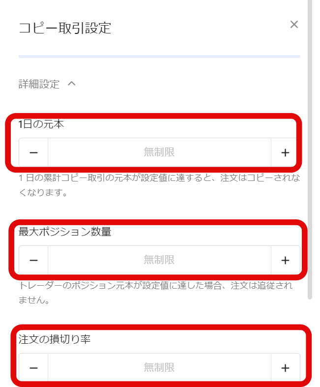 ・一日の最大損失許容額 ・最大ポジションの数量 ・注文の損切率