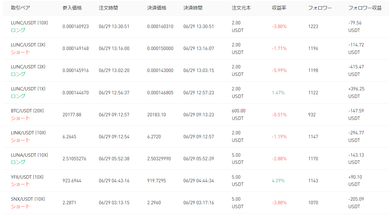 トレーダーの中には収益を高くみせるために、利益となったポジションを決済し損益のポジションを持ち続けることで合計損益率を水増しする人がいます。 未実現収益を確認したい場合は週次収支を確認しましょう。