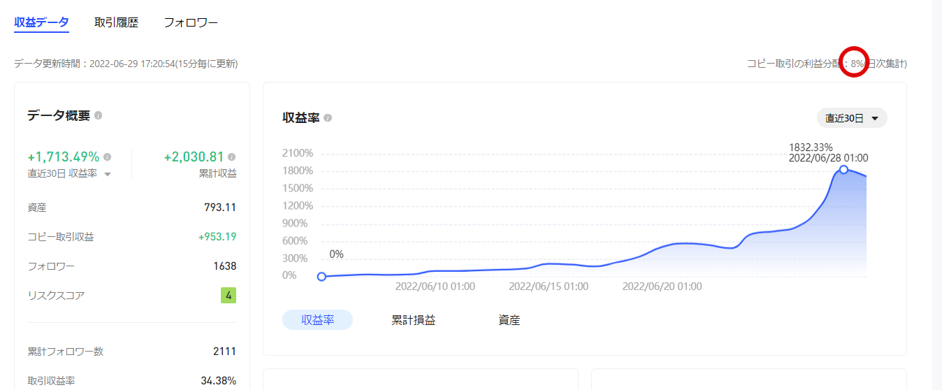 利益分配比率とは、コピートレードによって得た利益のうちトレーダーに分配される比率のことです。