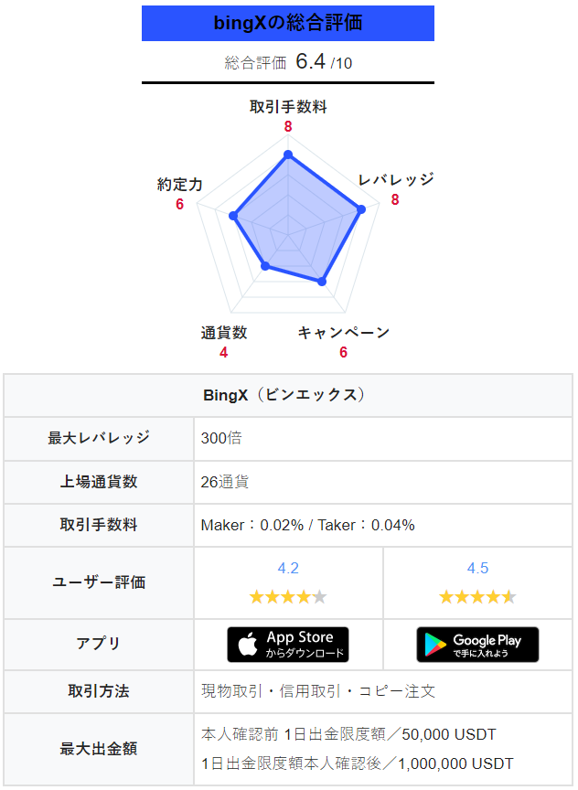 2018年にローンチしたBingbonという取引所が2021年11月にリブランディングされて「BingX」となりました。 BingXは3つのライセンスを保有している取引所で、追証もなく、最大レバレッジが150倍とスペックとしては非常に申し分ない取引所です。 また、豪華なキャンペーンを定期的に実施しているのも大きな魅力です。