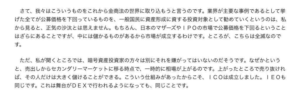 9月に開催された会合では、委員の岩下直行教授(京都大学、元日本銀行金融研究所)が、国内IEO案件のほぼ全てが公募価格を下回る壊滅的な実績を持つ商品を、一般国民向けの投資対象として金商法の枠組みで扱うことについて、「正気の沙汰とは思えない」と厳しく指摘していた。