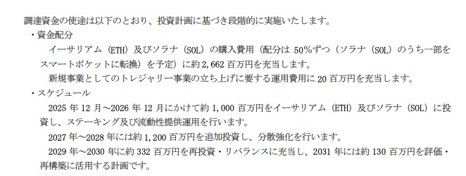 開示資料には、ETHとSOLをそれぞれ約50%ずつの比率で取得し、運用を通じて「年間利回り5〜20%程度」を目指すという、上場企業の計画としては極めて野心的な数値が明記されている。