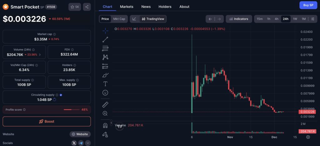 ポートフォリオの中で異彩を放つのが、ソラナ基盤のトークン「Smart Pocket(SP)」への投資だ。時価総額や流動性が主要通貨に劣る新興トークンを、上場企業がバランスシートに組み込む例は稀である。