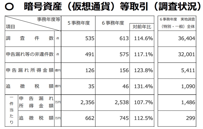 この数値は、所得税の実地調査全体における平均額299万円と比較して約2.5倍の水準にあり、暗号資産関連の事案では高額な修正申告に至るケースが多いことが示された。