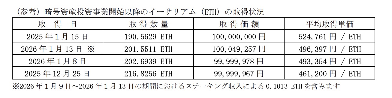 今回の取得数量は190.5629ETH、取得総額は1億円である。同社によるETHの取得報告は1月8日および13日の発表に続き、直近1週間で3度目となる。