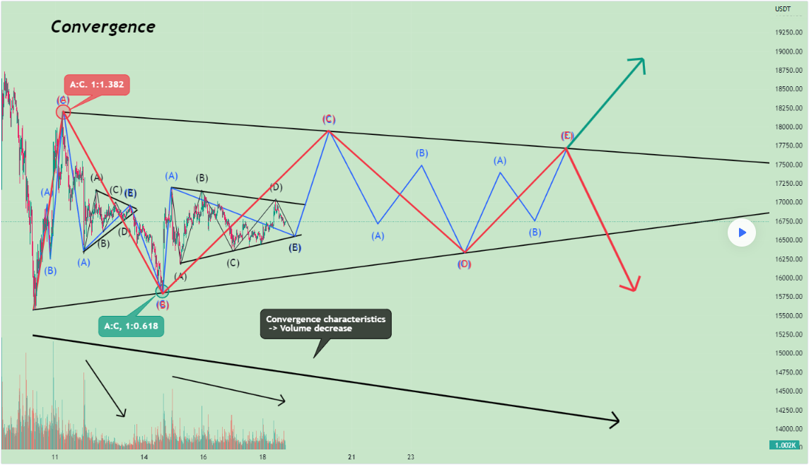 15.5kの底点から18.2kまで収束A波で見ています。 小波動はabcに割れ、A値とC値の比率が1:1.382にぴったり下がります。