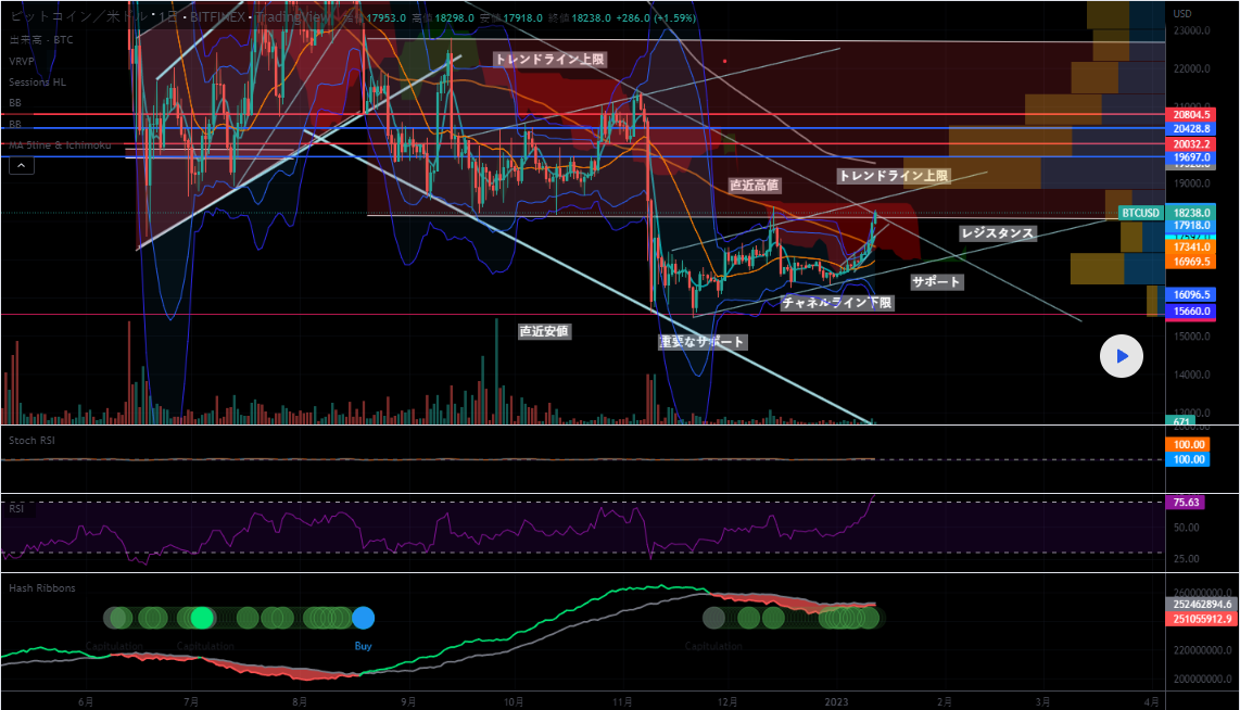 ビットコインは昨年の12月中旬以来の18000$を回復、bybitのデリバティブUSDT無期限では一時18300$オーバーまで値を上げた