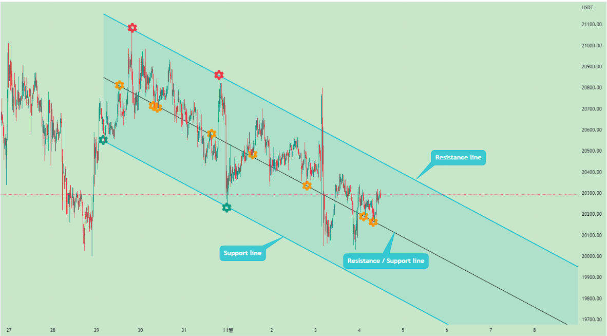 この平行チャンネルは、上/下線よりも中段線に注目する必要があります。