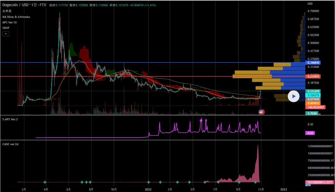 今回のファンダは、「イーロンマスクによるツイッター社の買収」から、DOGEコインがTwitterに採用されるのではないだろうか?という思惑からの噴き上げとなり、2022年初旬の価格帯である、一時0.15ドル付近まで値を付けた