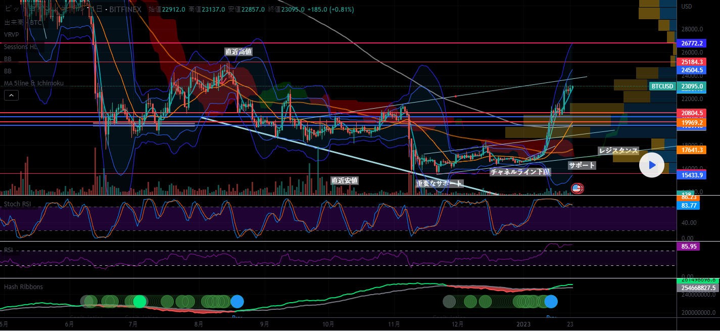 ビットコインは押し目という押し目を見せずに23000ドルを回復、2022年の9月頃の価格となる。