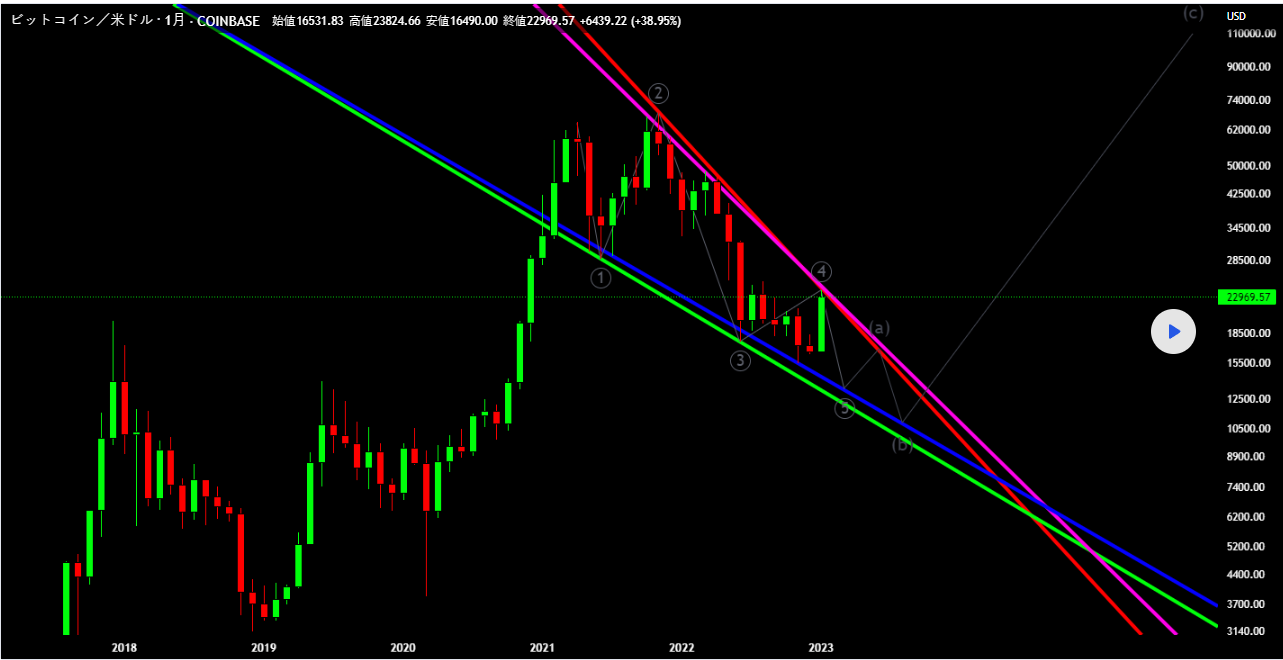 ビットコイン BTC は三角トレンドラインを縮める ビットコインは赤の下降トレンドラインをまだ突破していない 短期的にはレジスタンスである 通常の状況では、下の青ラインまたは緑ラインにフォールバックする 突破したとしても上部の赤とピンクのトレンド ラインは後で、このラインに戻ることになります。