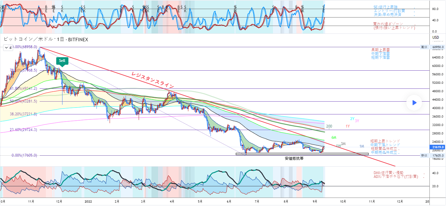 週末反発を見せているBTCは、赤のレジスタンスラインブレイクを狙っているように見えます。
