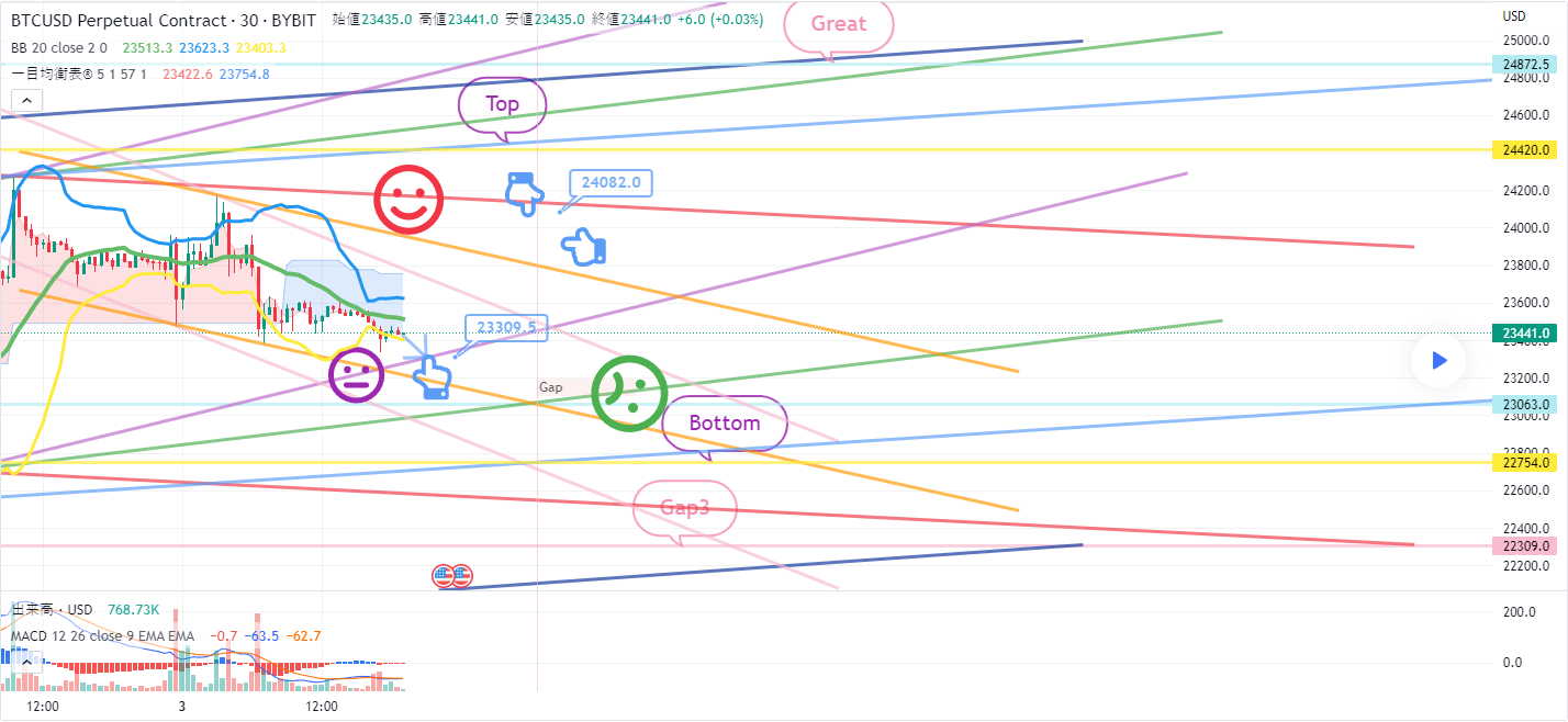 1. $23309.5 のロング ポジション エントリー セクション / 緑のサポート ラインを突破したときのストップ ロス -> $24082 のロング ポジションのターゲット