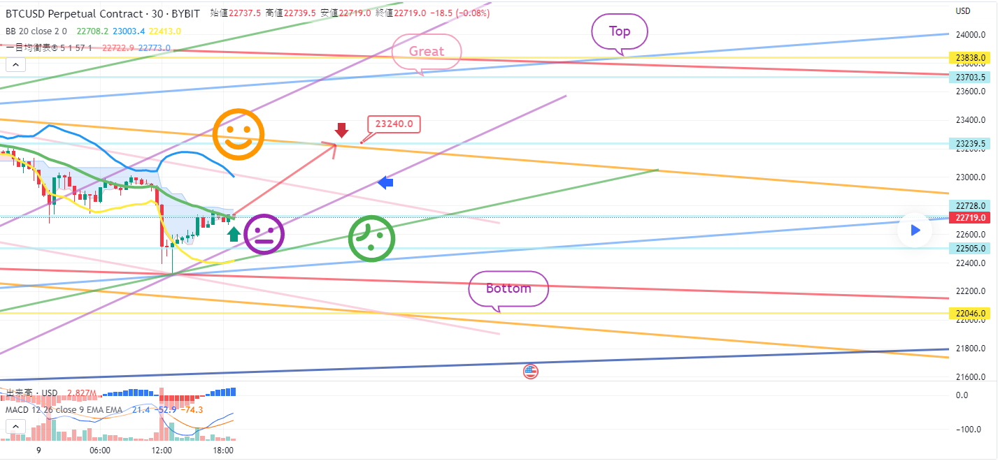 1. 22725.5ドル ロングポジション / 緑色の支持線離脱時の手節価 , 23240ドル 1次ターゲット -> 最終 Great区間 2次ターゲット