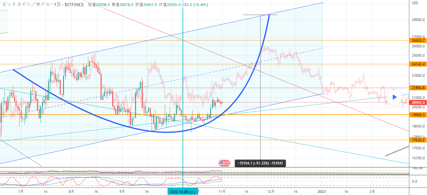 2022年3月あたりのチャートを重ねてみると、これから上に大きく戻してから再度底を探っていくという途中であることがわかります。