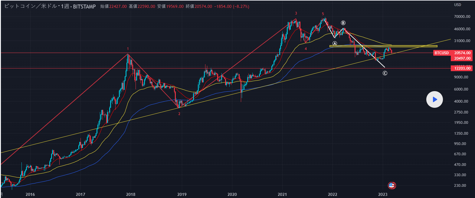 エリオット波動でみても約8年半かけて形成した上昇エリオット5波目形成後に2021年11月18日を起点に大きな調整ABCへと転じています。まだABCの着地点である$12203近辺には到達しておらず、0.786ABCである$20497近辺が逆三の左の谷付近ということもあって現在はサポートとして意識されています。
