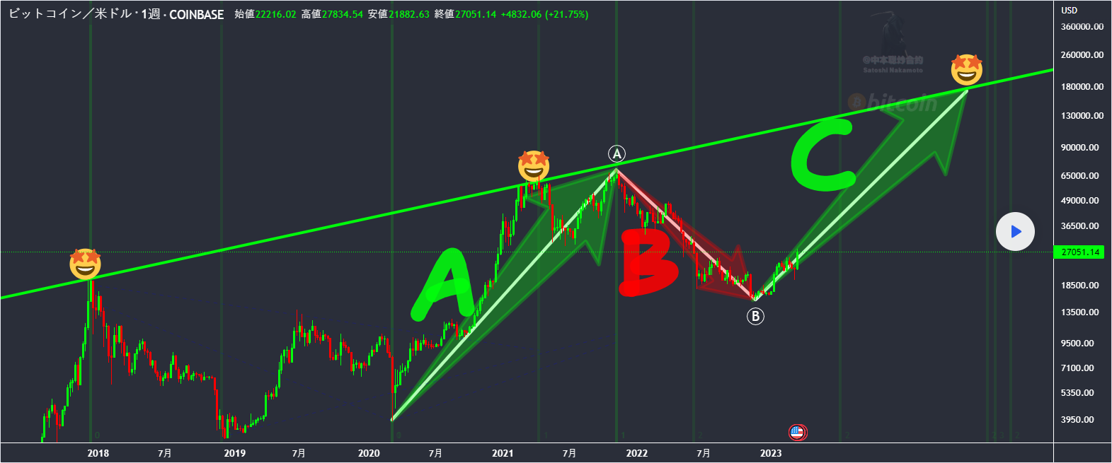 BTCビットコインのビッグサイクルABC波、緑線がトレンドラインがC波上昇の目標位置、縦線が到達時間帯、ABCの3波、A波上昇、B波下降、C波上昇、ロングラインは主に史上最高値近くに戻り、史上最高点を突破し、最終的に100,000以上の記録的な高値に突入.C波のボリュームは、200,000に近い位置に突入するのに十分な可能性があります. . C波のうねりは間違いなく過去最高を記録し、10万を突破するでしょう。