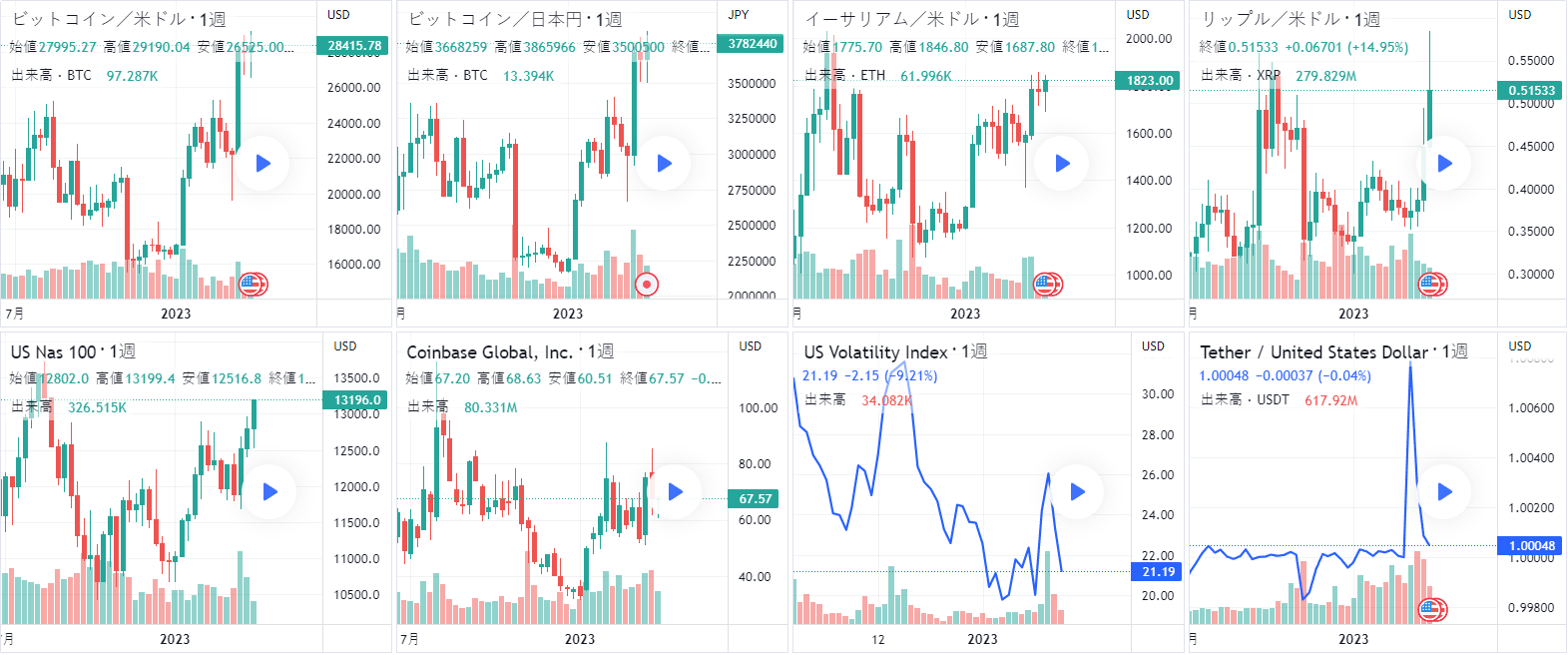 現在、ビットコイン(BTCUSD)、ビットコイン(BTCJPY)、イーサリアム(ETHUSD)、リップル(XRPUSD)、ナスダック(NAS100)、コインベース(COIN)、恐怖指数(VIX)、テザー(USDTUSD)の8つのチャートを同時に表示させています。