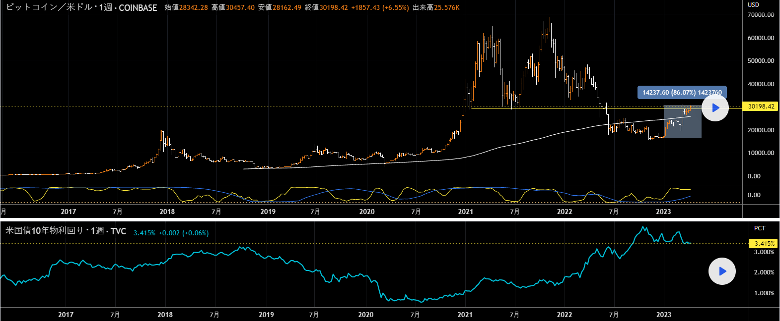 上昇している理由としては、アメリカの銀行破綻が相次ぎ「中央集権型の金融資産管理」に疑問視する意見も出始め、「分散型管理」の暗号資産に市場が関心が流れているようです。