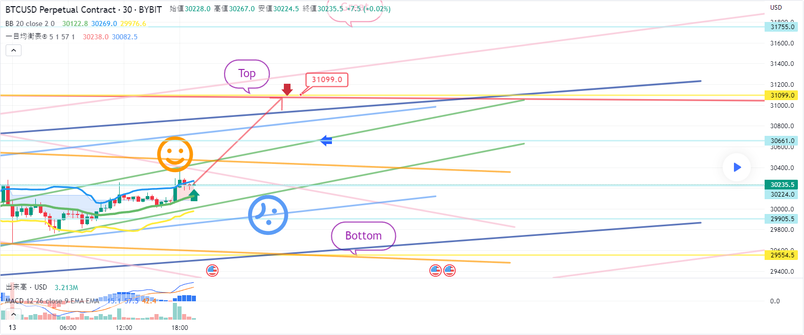 12885.4 ロングポジション進入以後、Topターゲットが到達。