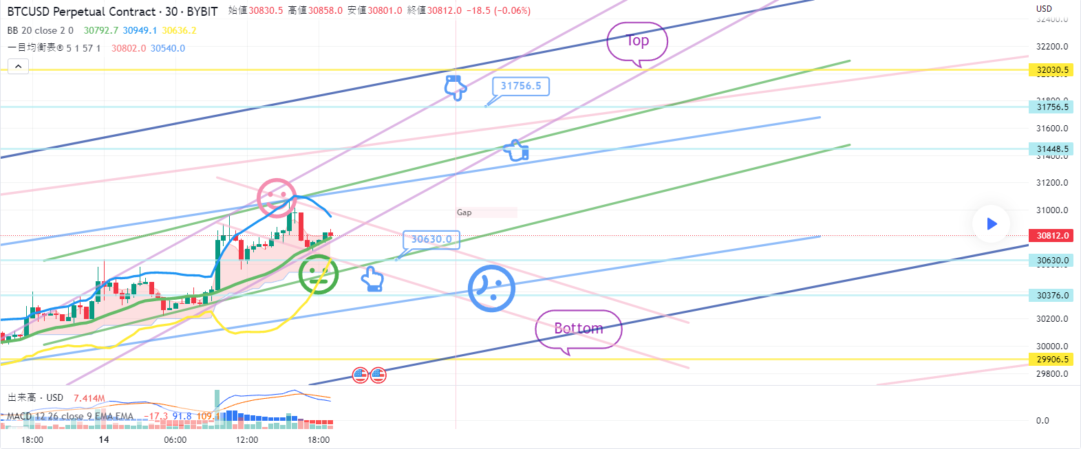 1. 30630ドルロングポジション入口区間 / 水色支持線離脱時手節街 / 31756.5ドル 1次ターゲット -> 32030.5ドル 2打車ゲット
