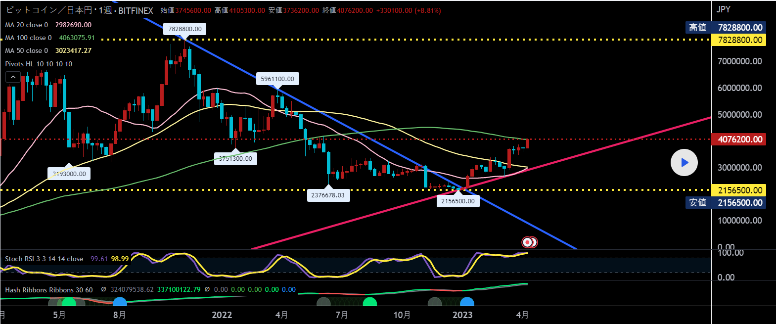 大きく崩れ値幅も無くなっていたビットコインは今年の週足陽線からは安値を割ることなくジワジワと上昇し、遂に久しぶりの400万円台へ!またもやHadhRibbonsは素晴らしい成績となった。しばらくは押し目買いが優勢となりそうだ。