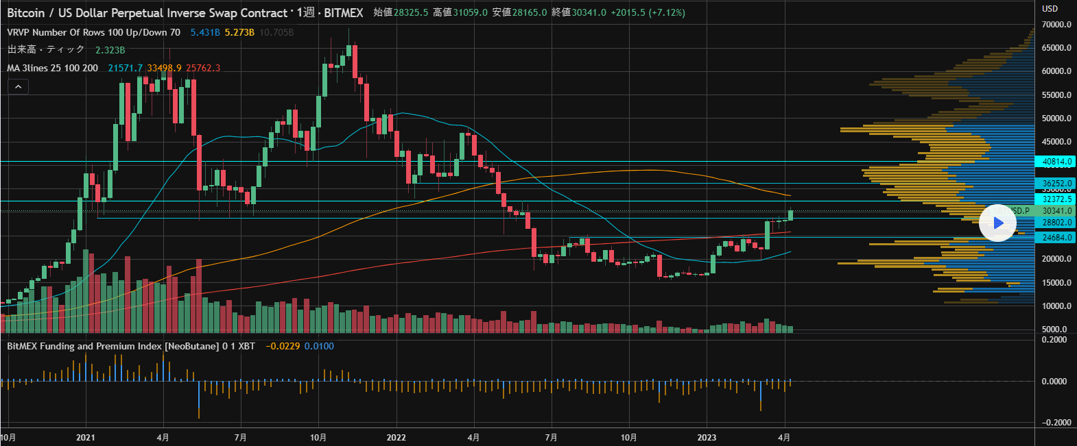 32000ドルより上は過去の出来高が多く上昇は至難の業、中長期的には買い場探し