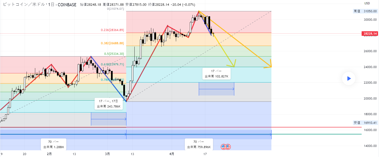 今回の下降が、4/14に高値を付けた後に始まったとすると、前回と同程度下降する場合、24,000usd付近が、約6割下がったところとなりそうです。