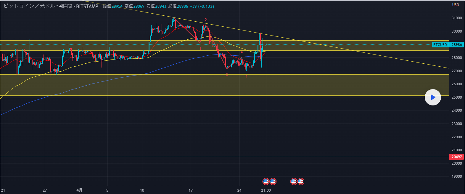 4波と見ていた下落が調整が浅かったということもあり、これが3波の一部となり、結果的には赤のカウントになりました。赤のエリオットカウントで5波を形成したということもあり、買い検討ゾーンである$25100~26725に歩届かず反発してしまいました
