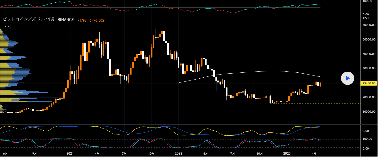 30,000ドルが大きな壁になってきます。週足で確認してもここは過去に幾度も抵抗ラインとなってきた節目であることが分かります。