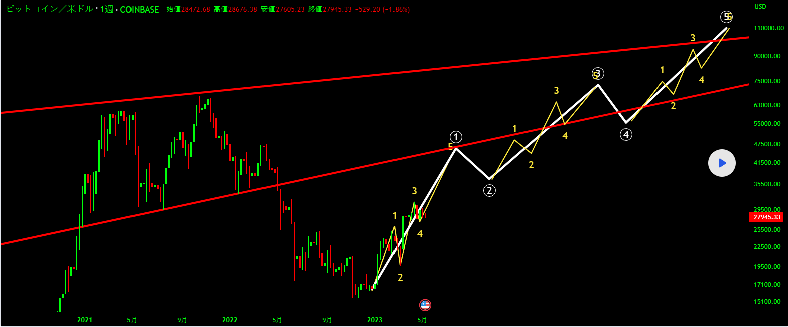 ビットコイン BTC は週間ラインに 5 つの波があり、長期的な強気相場は上部の赤いトレンド ラインに到達します。