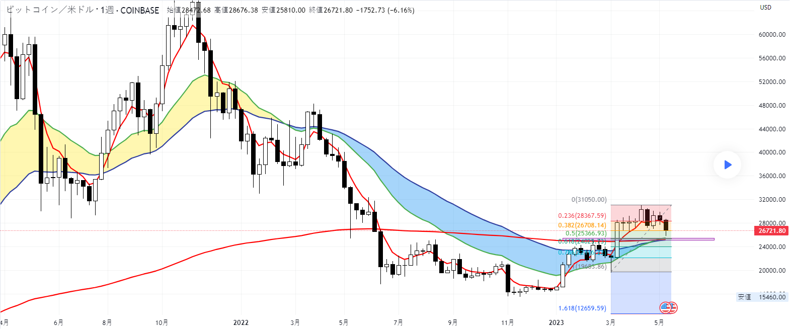 BTCUSDは、5/6から下降し、5/12には一旦、25,810usdまで下がりました。