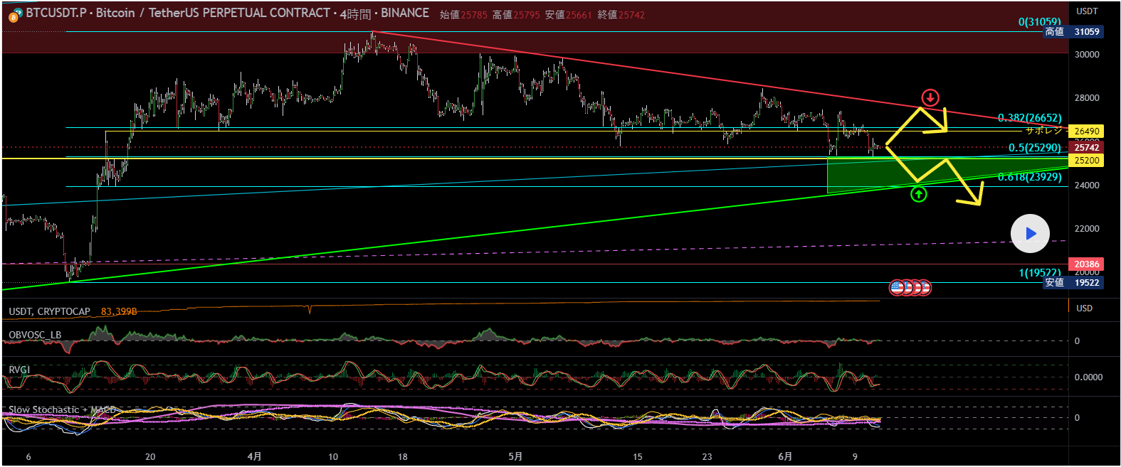 特に水平線(26490)と水平線(25200)は3/10の安値(19522)から4/14の高値(31059)のフィボナッチ38.2%と50%が重なるラインでもありかなり意識されると思われる。