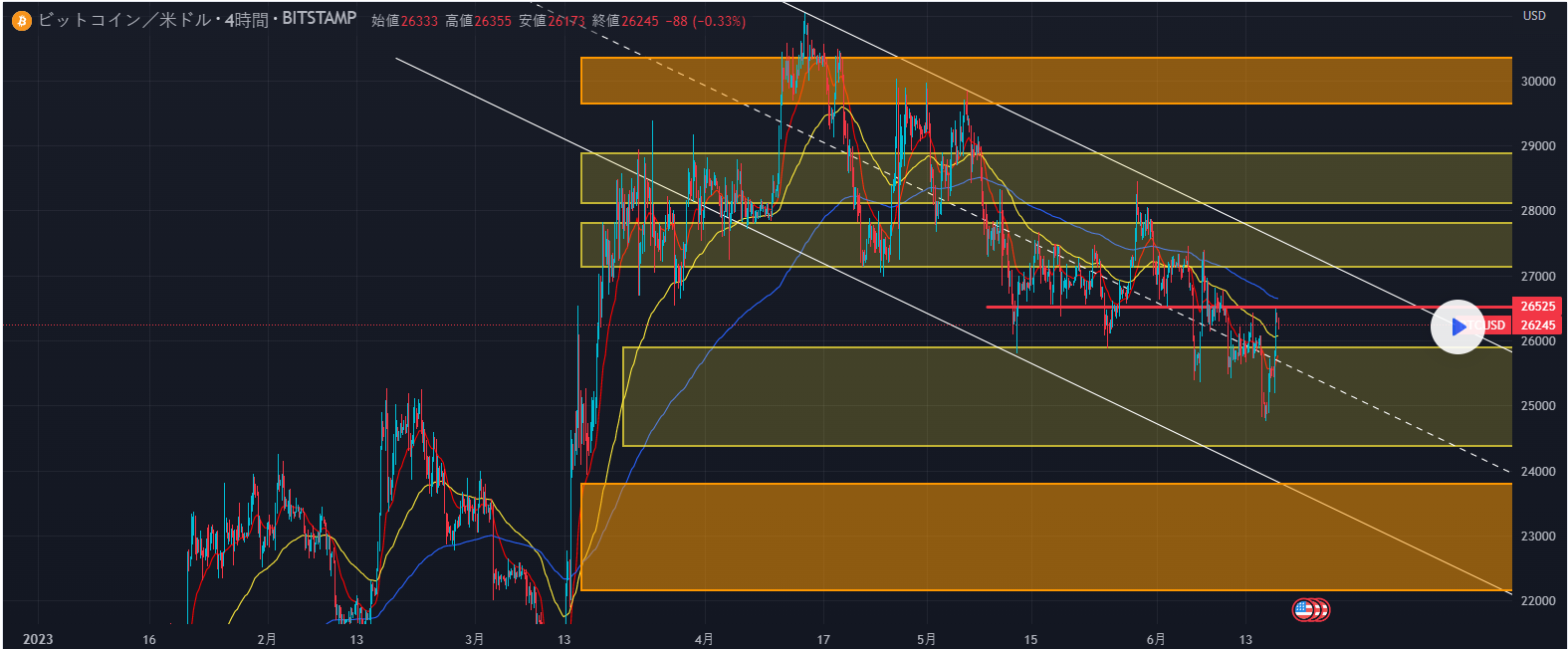 $27130~27800と、さらにその上の$28120~28875はアセマネの平均売買価格が集積していることもあって、やはりここは上値が重くなりやすそうで、日足では50SMAと100SMAのデッドクロスが認されているためテクニカル的にも下押し圧力は継続でしょうか。
