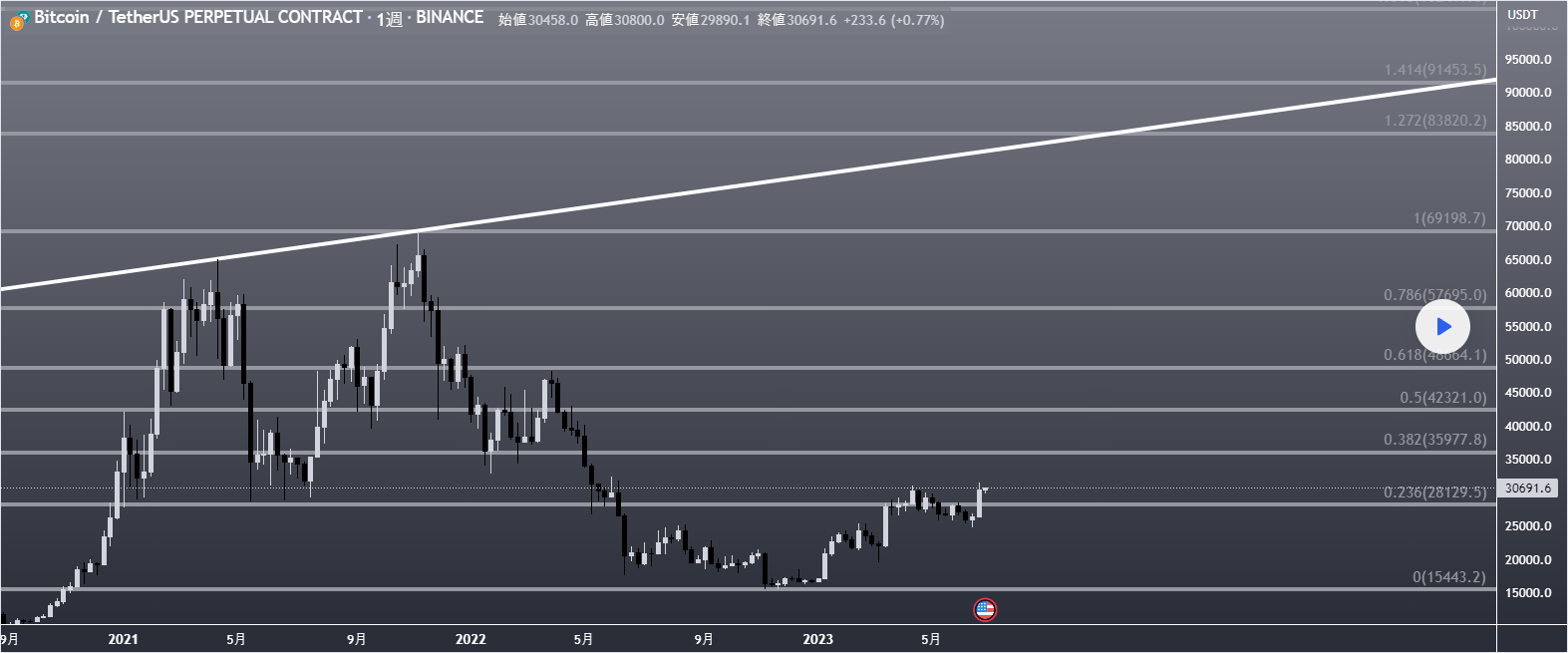ビットコインBTCフィボナッチ分割線、主なターゲットはフィボナッチ高値の上部にあり、最終的には上部トレンドラインに到達します。