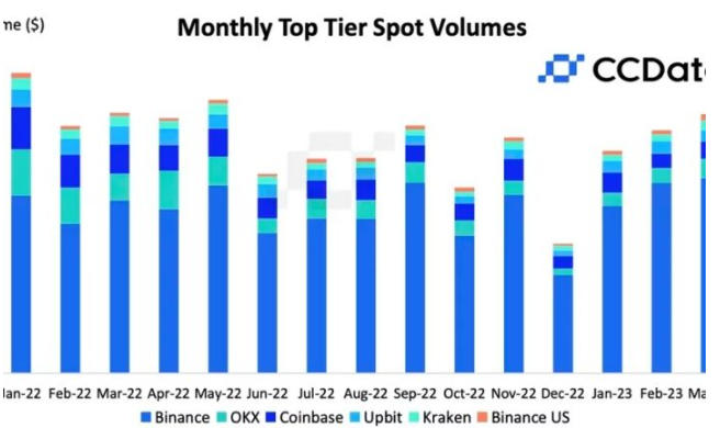 取引高の減少はバイナンスだけではない。中央集権型取引所全体のスポット取引高は40%減少、2022年12月以降で最も低くなった。CCDataによると、アメリカでの複数の銀行破綻に加え、景気後退懸念が高まるなどマクロ経済状況を取り巻く不確実性が取引高の減少につながったという。