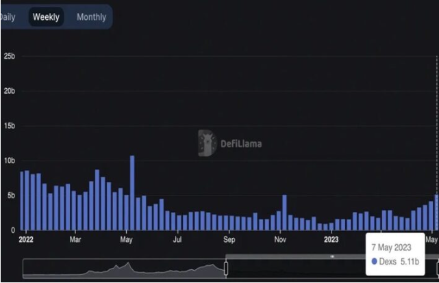 BNBチェーンのDEX(分散型取引所)の取引高(週次)がDefiLlamaのデータによると、過去1年の最高水準に達した。