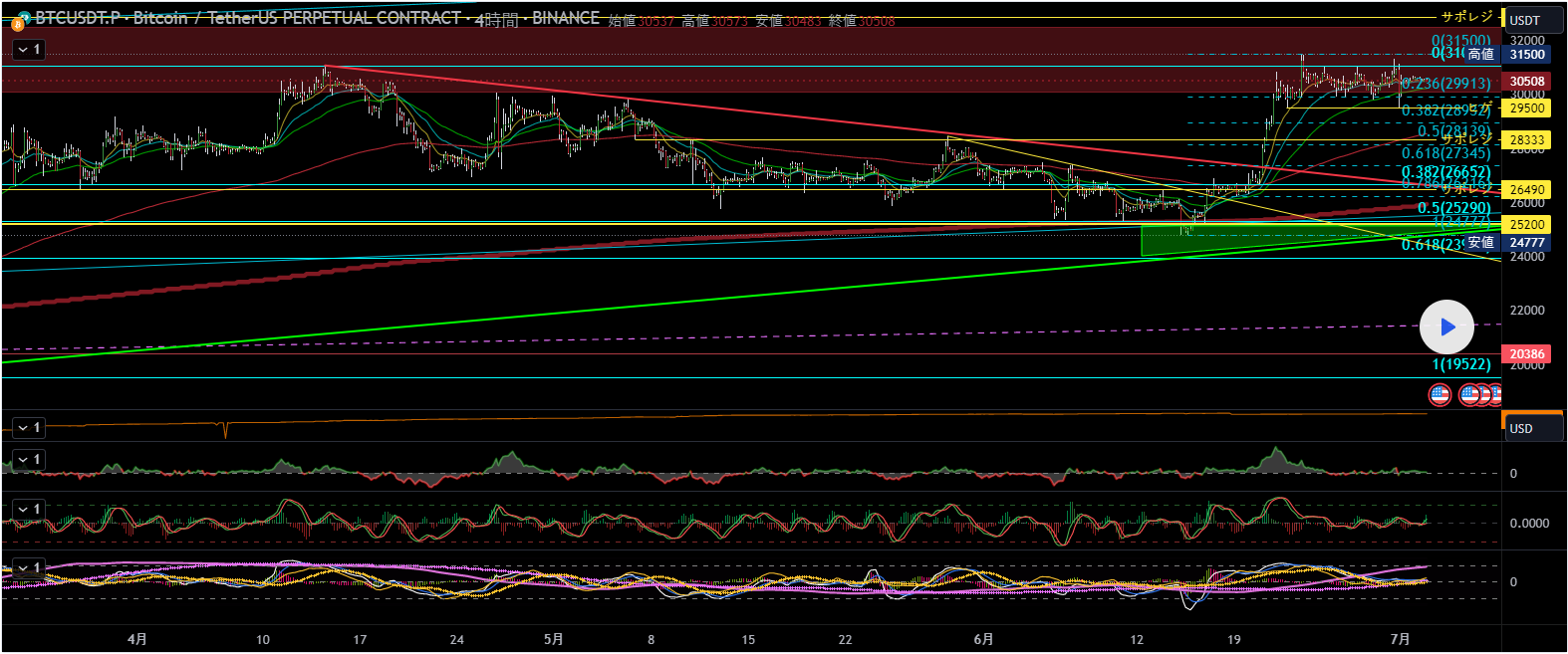 6/15の直近安値から6/23の直近高値に引いたフィボ50%(28139)〜61.8%(27345)