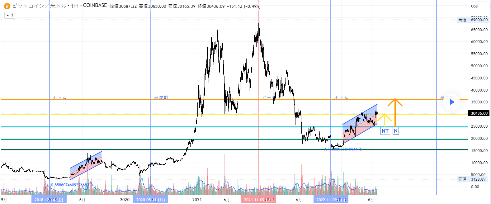すでに、3/10の押し目から6/15の押し目までの値幅をベースとするNT計算のライン(30,000usd付近)は達成しているため、次の目標は、3/10の押し目から4/14の高値までの値幅をベースとするN計算のライン(36,000usd付近)になるかと思います。