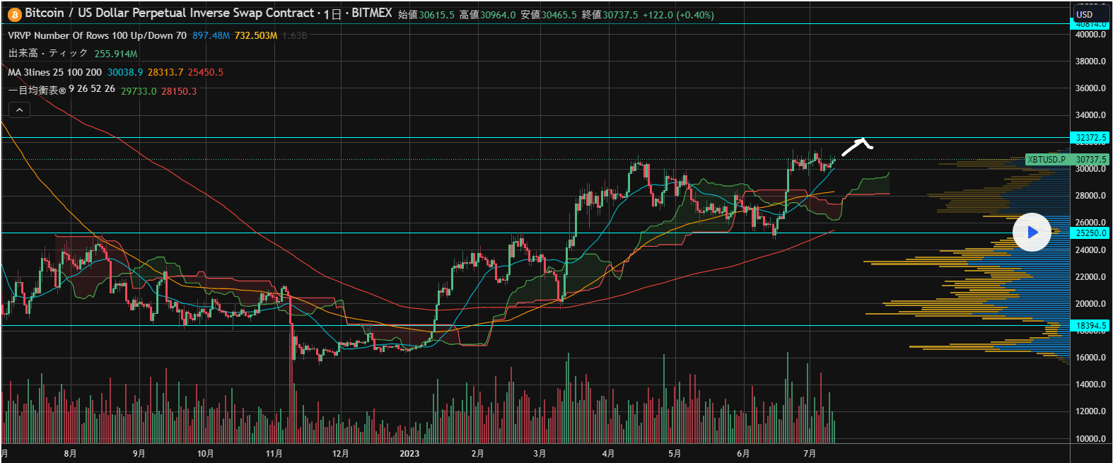 30000ドル台で停滞するビットコイン、夏枯れ相場感も出ておりトレードする旨味はあまりない。30000ドル台前半からレンジ上限31000後半~32000を伺うトレード。もしくは27000あたりまで下がるのを待ち長めに持てるポジションを作るかどちらか。