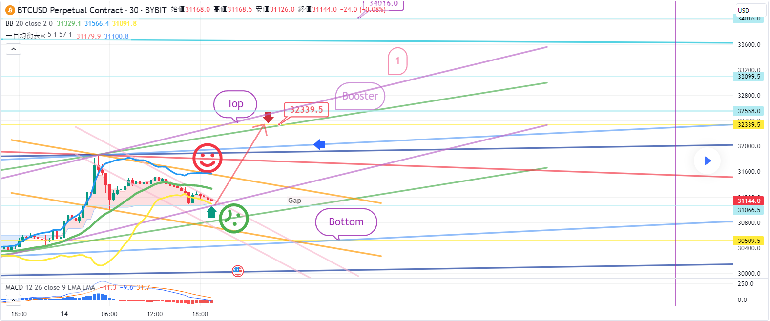 2. 32339.5ドル ロングポジション 1次ターゲット -> Boosterから34016ドルまで週末のターゲット区間