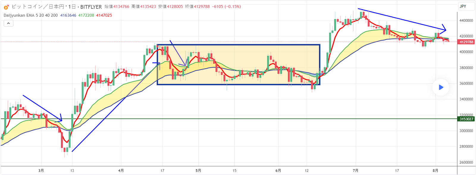 途中でレンジ相場や一時的な下落が入る可能性があるため、