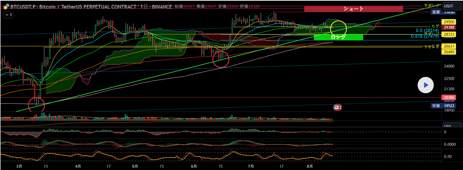 フィボ50%(28314)を背に61.8%(27479)付近まで買い下がりor 日足200emaまで