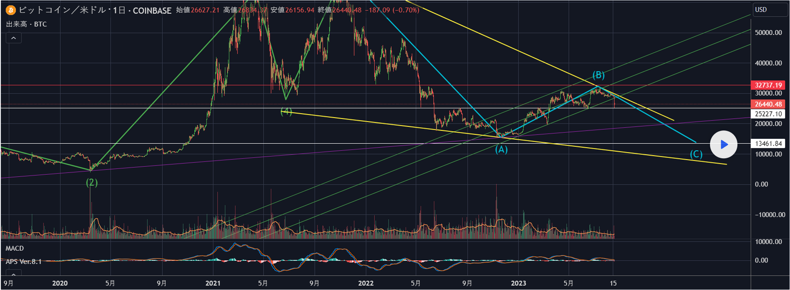 BTCは上昇チャネルを割ったことでEWの修正C波の始まりと考えてられます。