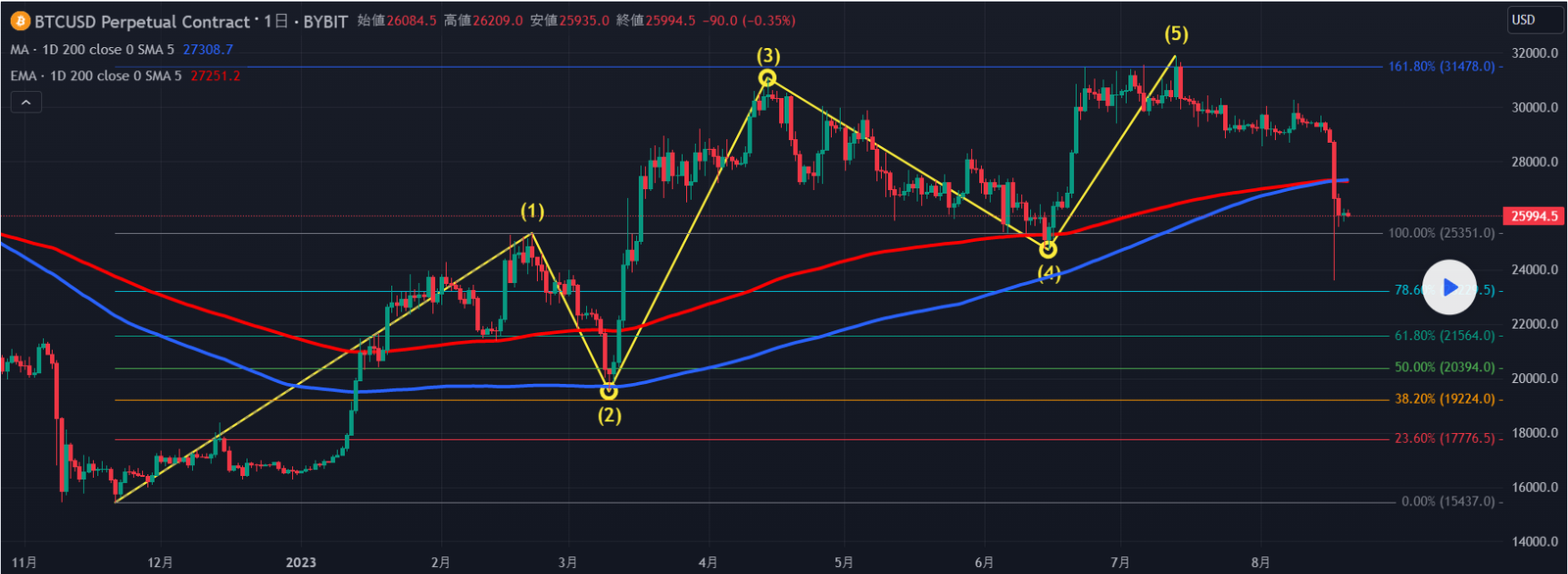 ビットコイン/ドルのお試しエリオット波動分析です。