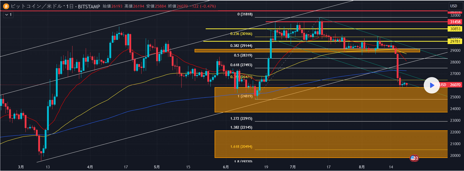 とりあえず、先ほども述べたように現状はフラット調整内の動きとなっており、様々な乖離指標が下ザヤとなっていることから23700~25820ドルでは一旦サポートとなりそうですが、短期的には、この調整ABCを超えて下落しており、エリオット波動下落4波目形成中に見えるので、この安値を再度下まわって5波目を形成する可能性はありそうです。23700~25820ドルでは一旦サポートされる可能性が高いのですが、その動きの予測は少し難しいですが、メインシナリオは赤か青のような動きをイメージしています。但し、26860~27560ドルではボラの上限と下限が位置しているので一旦上値は重くなりやすいでしょう。このポイントのようにズルズルと下落して安値をきって反発する可能性もありそうです。エリオット下落3波が継続していく可能性もあるので、そうなると19805~22125ドルまで下落する可能性が高いでしょう。