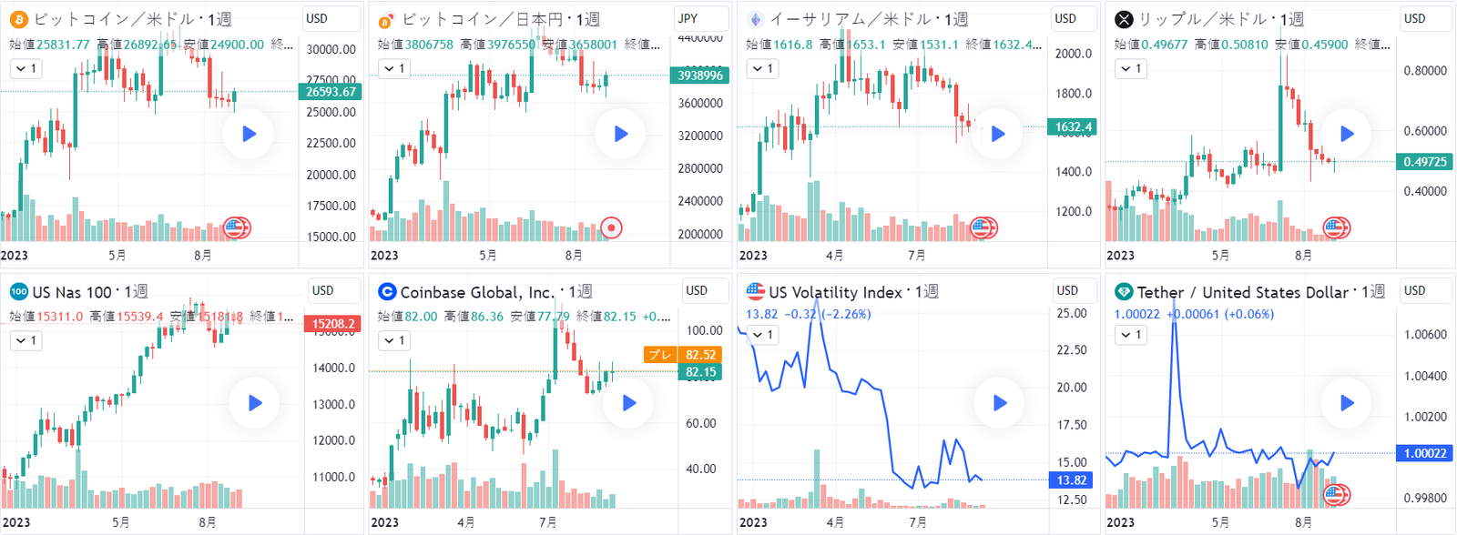 6月半ば、SEC対リップル社のXRPに関する判決を受けリップルが急騰しました。これを受けビットコインも上昇、その後緩やかに下落したものの、8月初旬27000ドル~28000ドルあたりから反発を予想する声もチラホラ、実際に上がりそうな気配もありましたが、逆に8/18(金)イーロン・マスクのSpaceXがビットコインを売却したとの報道で暗号資産が急落してしまいました。そして8/29(火)SECによるビットコインETF却下不当の米高裁判決が出て暗号資産が急騰、しかしその後数日で上昇分全戻しとなり、9月に入って停滞期間が続いています。先週は少し上向きですが…さて?