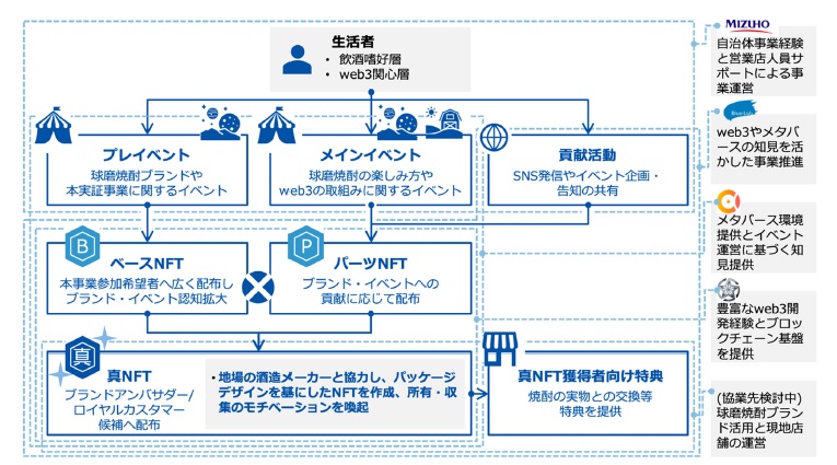 そして「ベースNFT」「パーツNFT」の両方の保有者には、球磨焼酎の交換券、試飲会への参加券などの「特典」がある「真NFT」が交付される仕組みを構築する。さらに球磨焼酎を製造する地場企業とも連携していくという。
